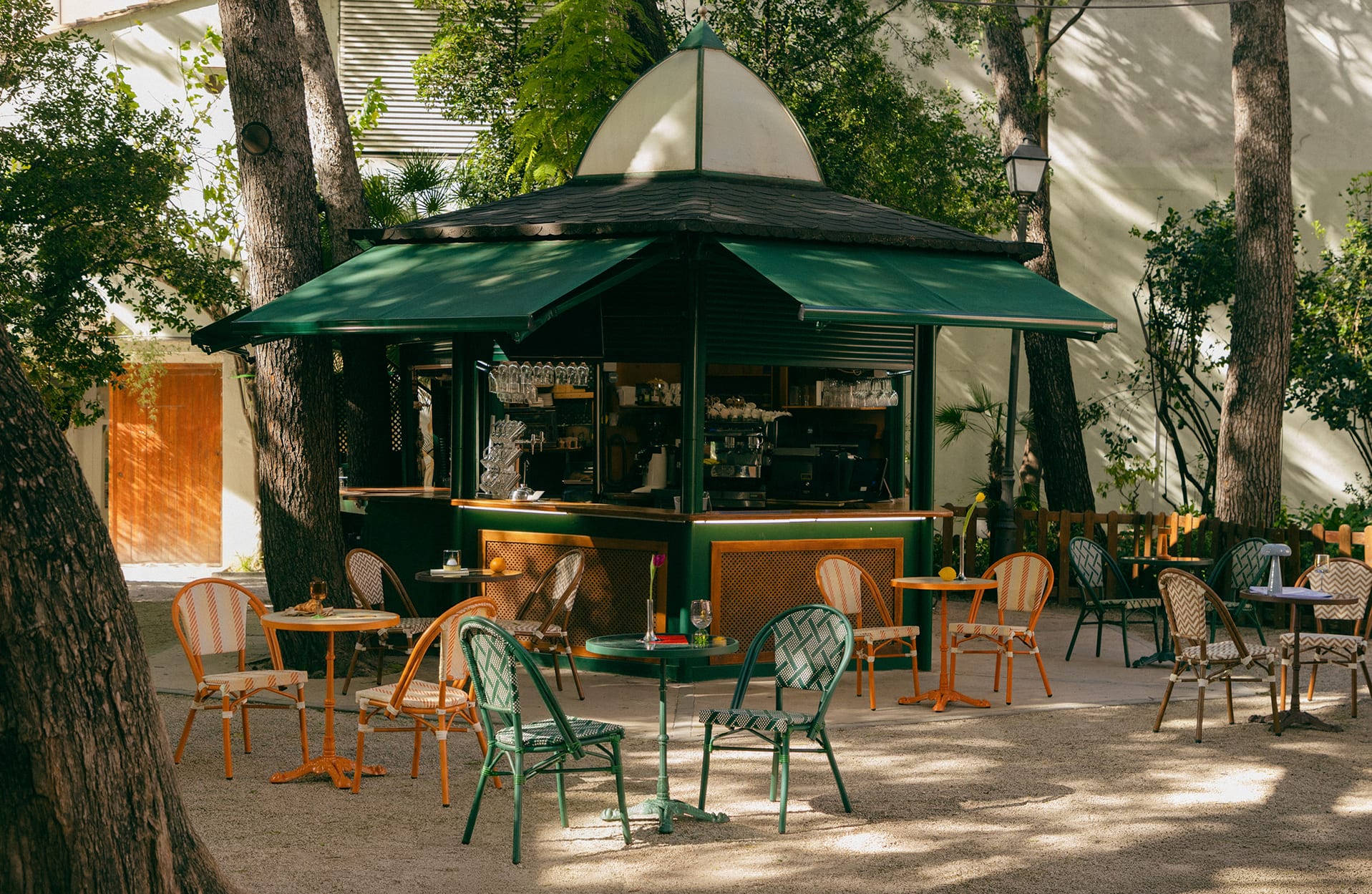 ENTRE ÁRBOLES Y LUZ DORADA, APARECE UN QUIOSCO. UNA MESA. UNA SILLA. NADA MÁS HACE FALTA. EL GESTO DE SENTARSE TRANSFORMA EL ESPACIO PÚBLICO EN ALGO ÍNTIMO: UN CAFÉ A MEDIA MAÑANA, UNA CONVERSACIÓN QUE SE ALARGA, EL PLACER DE NO MIRAR EL RELOJ.
