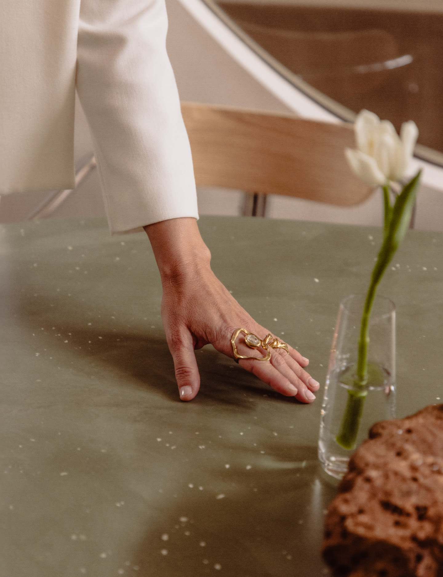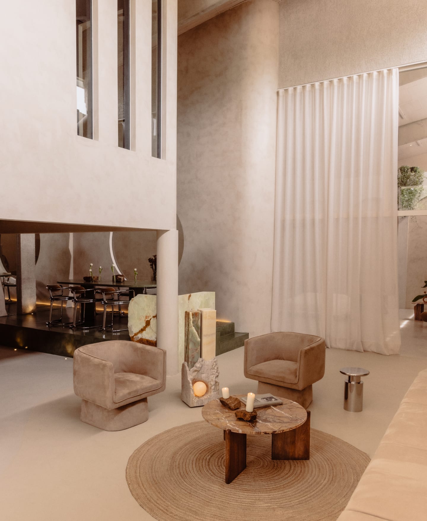 Diria que a peça principal é o próprio espaço — o vazio que ele contém. Mas, se tivesse que escolher uma, diria a escada, como uma escultura brutalista, é o coração do lugar: firme, sóbria, quase sagrada, feita com restos de ônix descartados de uma pedreira. Essa é a melhor parte do projeto: poder incluir essas peças e dar-lhes uma segunda chance. Resgatar sua beleza natural e torná-las protagonistas. Adoro essa história, a história das segundas chances. NOSSA MISSÃO é mostrar que a beleza e a sustentabilidade não só podem coexistir, mas criar algo inovador e desejado. No estúdio, dizemos: “Do esquecido, o inesquecível... Essa frase resume tudo.”