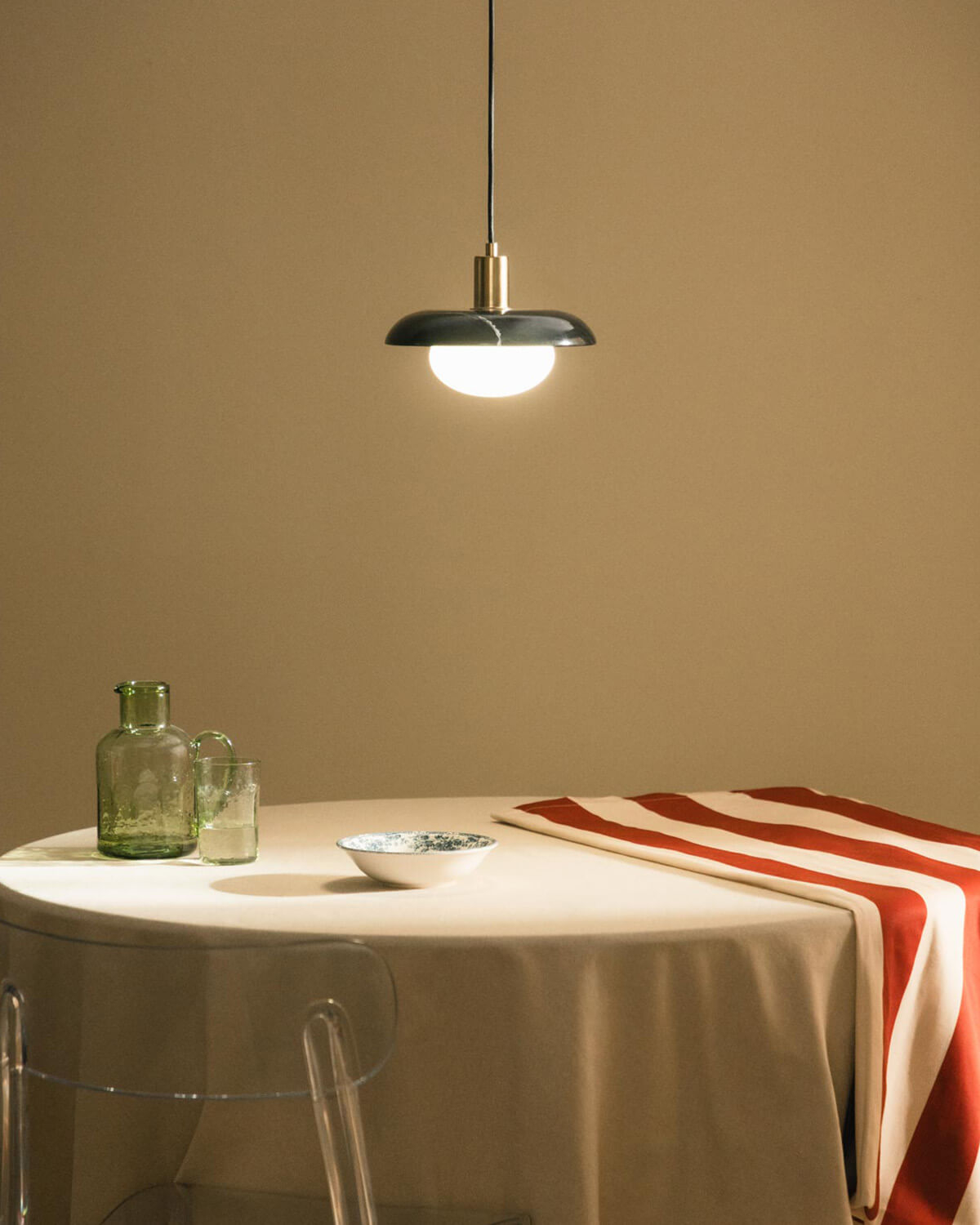 Uran Marble Ceiling Lamp The Uran Marble Ceiling Lamp is a piece of lighting that features a sophisticated design. Made with a Marble shade, a Crystal sphere (Ø15x8.5 cm) for G9 bulbs, its cable is covered in textile and the ceiling support is made of Iron. The marble provides a natural texture and a variation of tones that add depth and character to the pendant lamp. It is ideal for living rooms, where it can be the center of attention and provide a personal touch. It can be hung over a coffee table to illuminate the seating area and create a warm atmosphere. In the dining room, its arrangement over the main table not only provides a pleasant light for meals, but also adds a decorative element and in the hall or entrance hall, the ceiling lamp creates a good first impression. Its versatile and elegant design makes it suitable for any space where a focal point of lighting is desired. When cleaning it, use a cloth, avoiding the use of chemical products.