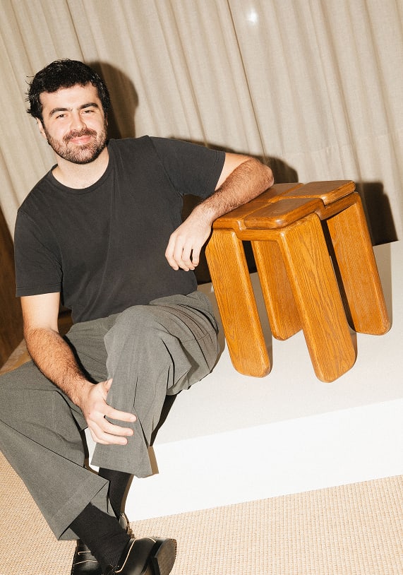 He transforms oak wood into a poetic knot, combining function and aesthetics. His work balances bold forms with artisanal processes, resulting in visually rhythmic pieces that verge on sculpture.